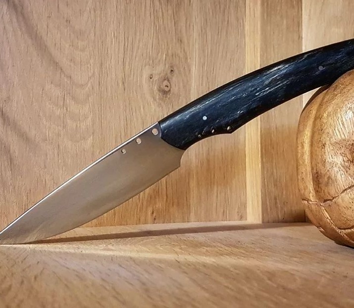 Couteau forgé en acier C70, manche en hêtre stabilisé, longueur totale : 21 cm, lame : 10 cm, ép : 4 mm (vendu)